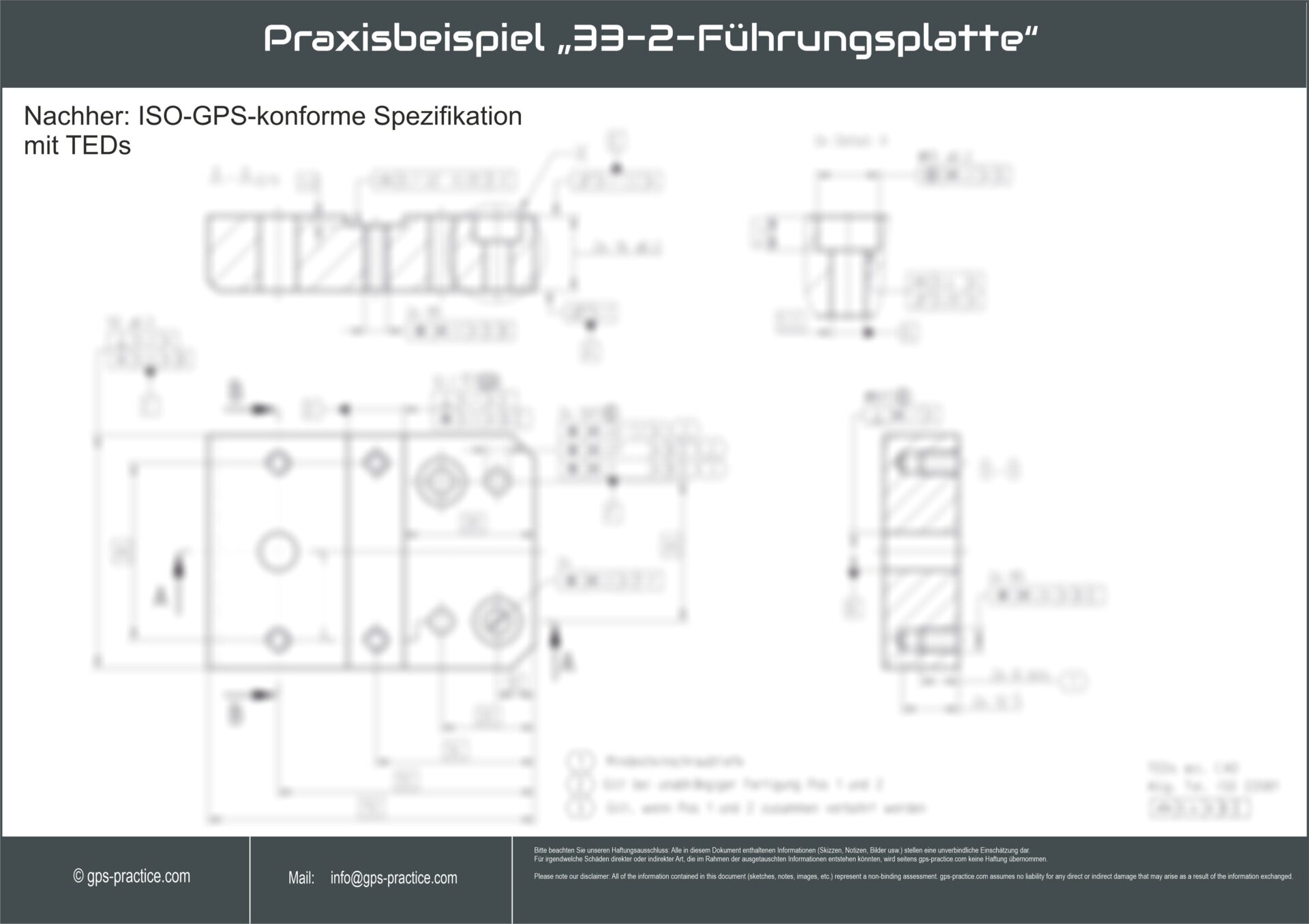 In einem Vorher-Nachher-Vergleich wird gezeigt, wie eine zunächst mehrdeutige Zeichnung in eine ISO-GPS-konforme und damit funktionsgerechte Darstellung überführt wird. Dabei werden unter anderem Fügeabsichten durch eindeutige Spezifikationen sichtbar gemacht. So wird nachvollziehbar, welche negativen Auswirkungen