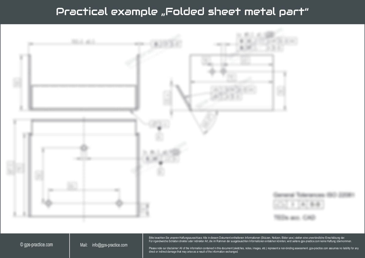 A folded sheet metal part is specified. Establishing a datum system (using datum targets in V2) is compared in 2 different variants and typical features such as hole patterns are described. To meet the typical (product specific) requirements of bending sheet metal components, a „floating pattern“ tolerance is used.